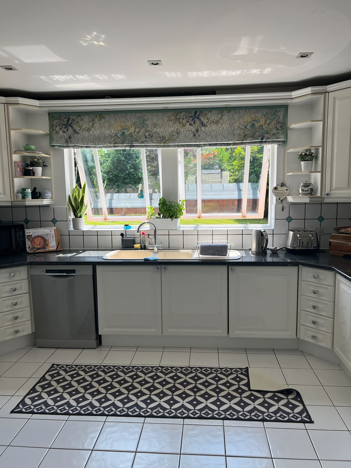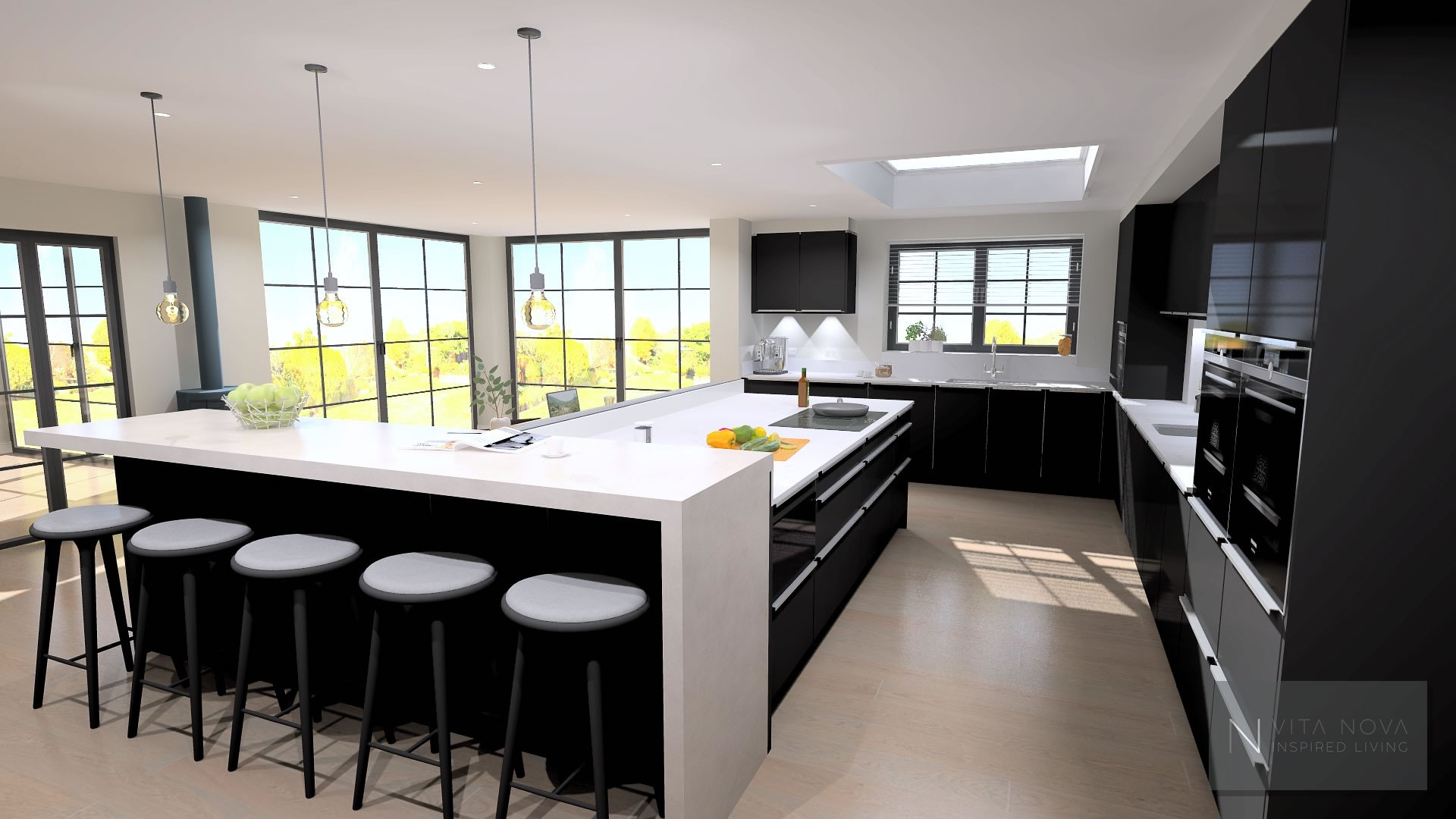 The new kitchen combines bold design with practical functionality. The cabinetry features a black matt finish with integrated stainless steel handles, paired with white quartz work surfaces for a crisp, contemporary look. A light grey concrete-effect laminate breakfast bar softens the contrast and adds texture to the space.