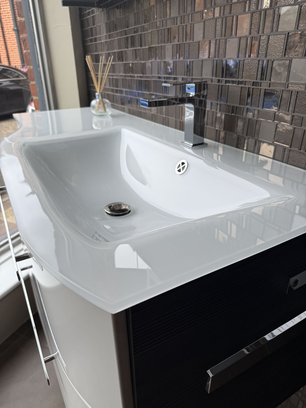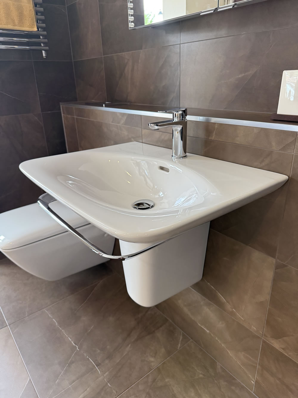 - 650mm (w) x 485mm (d) basin with chrome towel rail attached below basin.