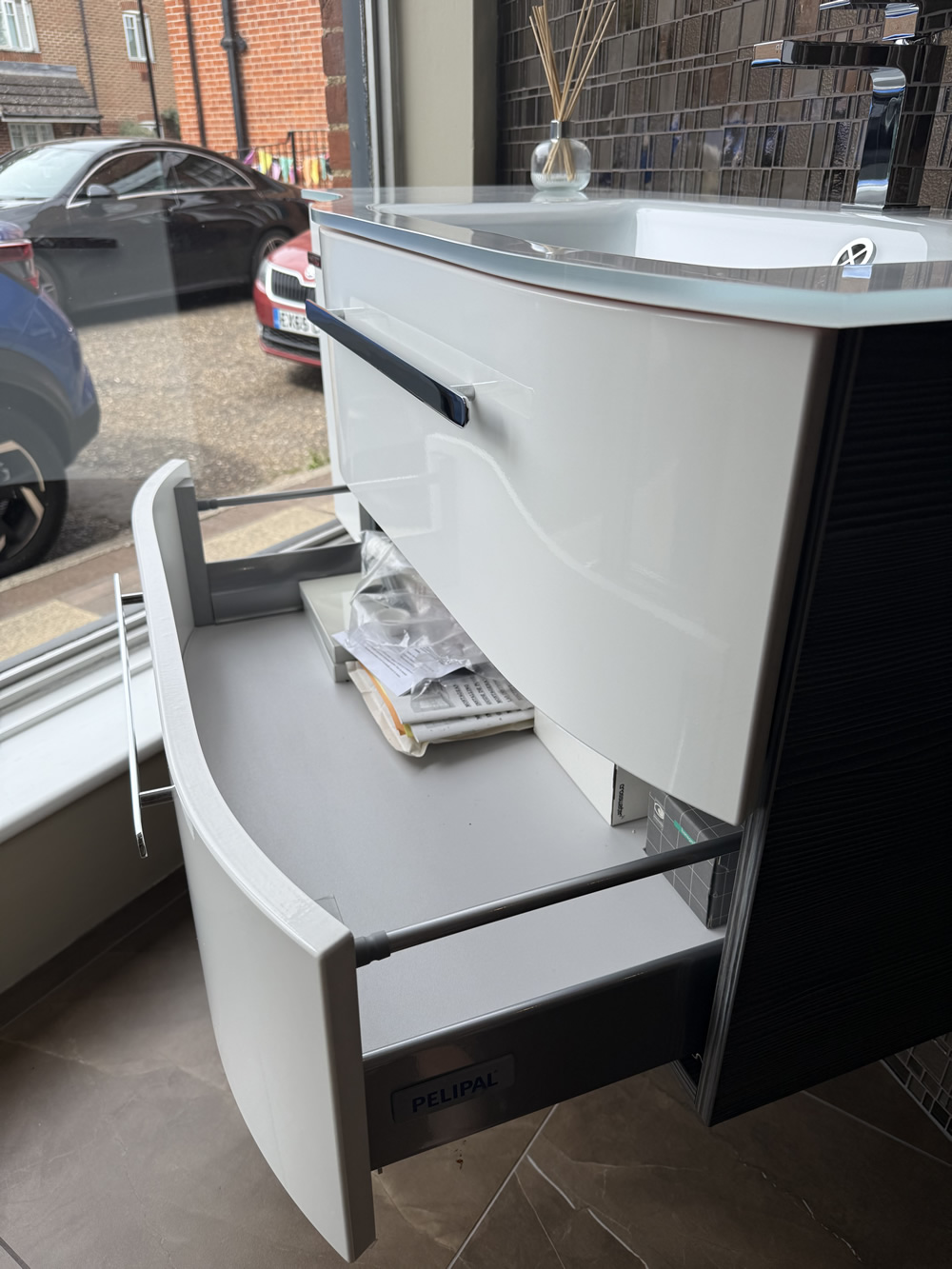 - Pelipal Opticlear white glass off-set basin